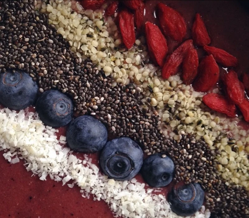 Toppings: coconut flakes, blueberries, chia seeds, hemp seeds, goji berries.